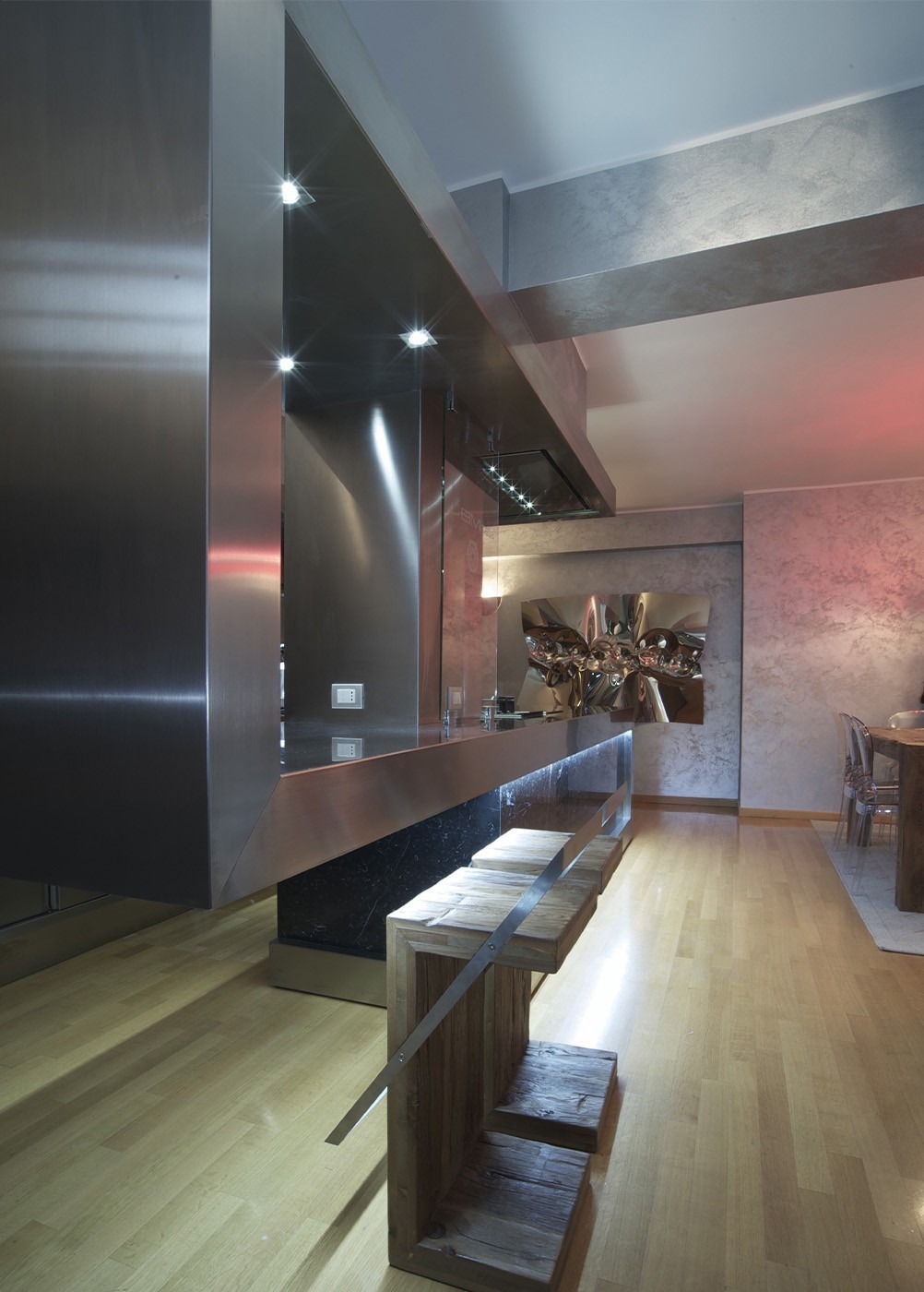 BM Italia ha progettato e realizzato lo spazio conviviale in cui l'elemento cucina è un monolite in acciaio con inserti di marmi rari, lavorato con una tecnica particolare che lo rende un pezzo unico della Collezione Privata Castello Pozzi, ambientandosi senza compromessi o sensi di inferiorità alle opere dello scultore Helidon Xhixha che proprio dell'acciaio ha fatto il suo materiale preferito per la creazione delle sue importanti opere.