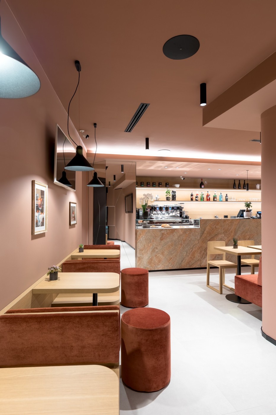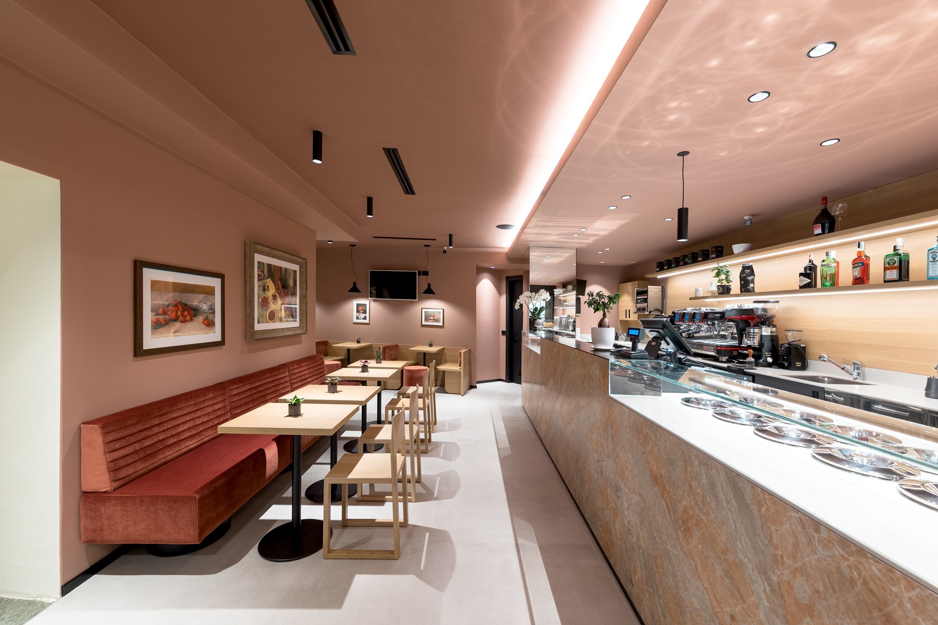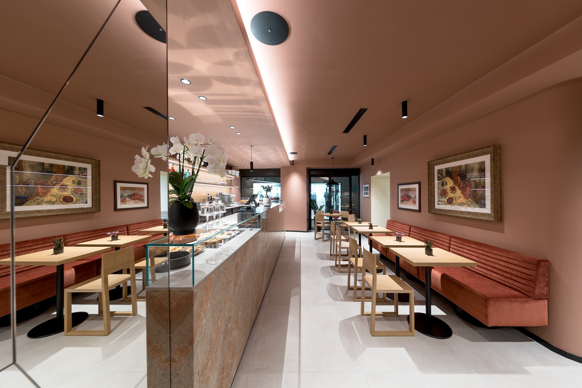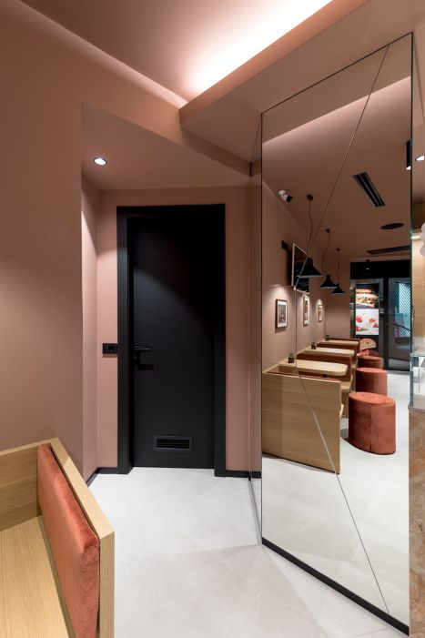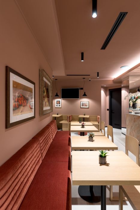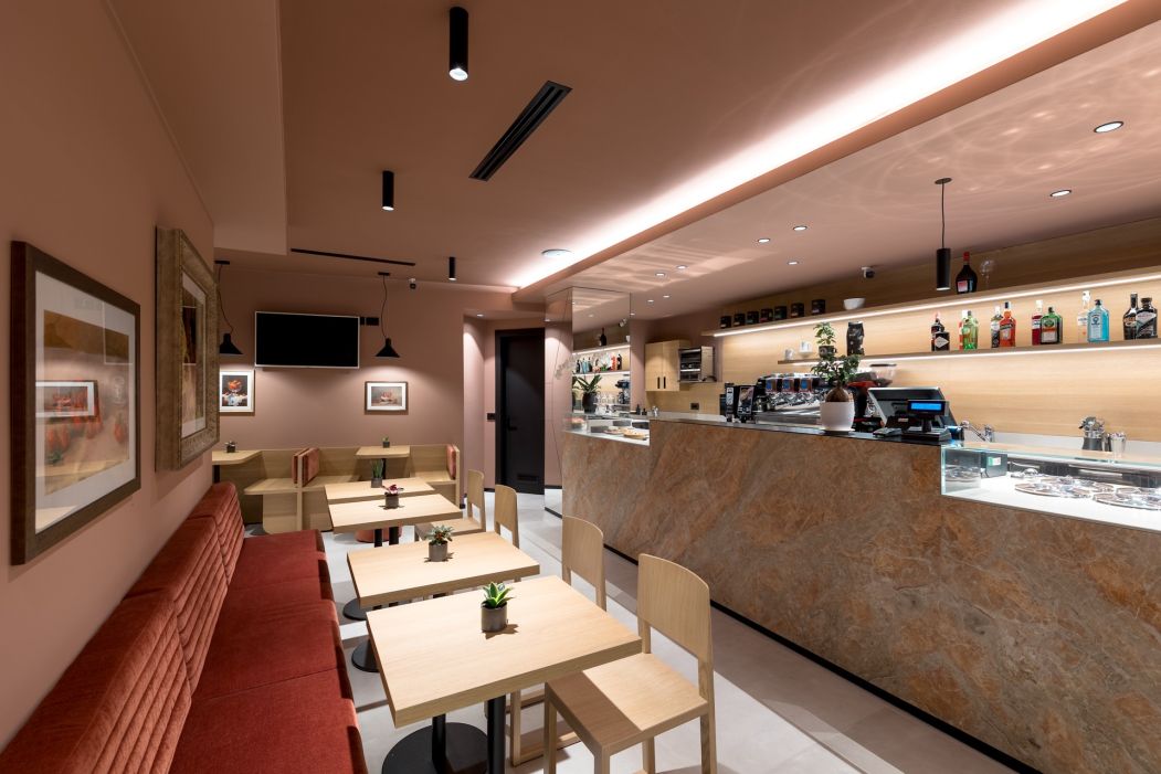 Per farlo, è stato introdotto un nuovo rivestimento cromatico che avvolge pareti e soffitto, generando un morbido effetto “scatola” che definisce e avvolge lo spazio interno, rendendolo visivamente accogliente e riconoscibile.
