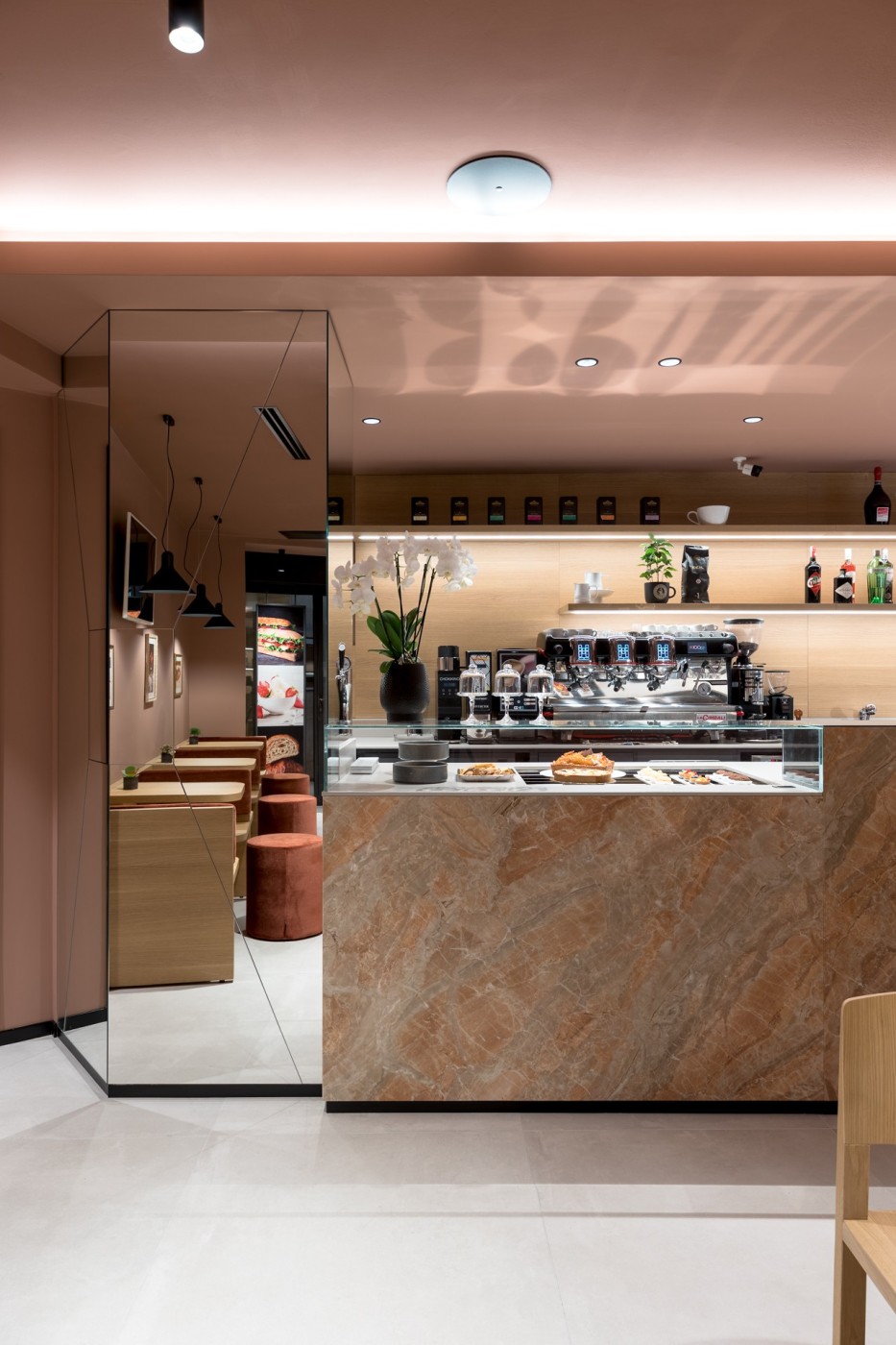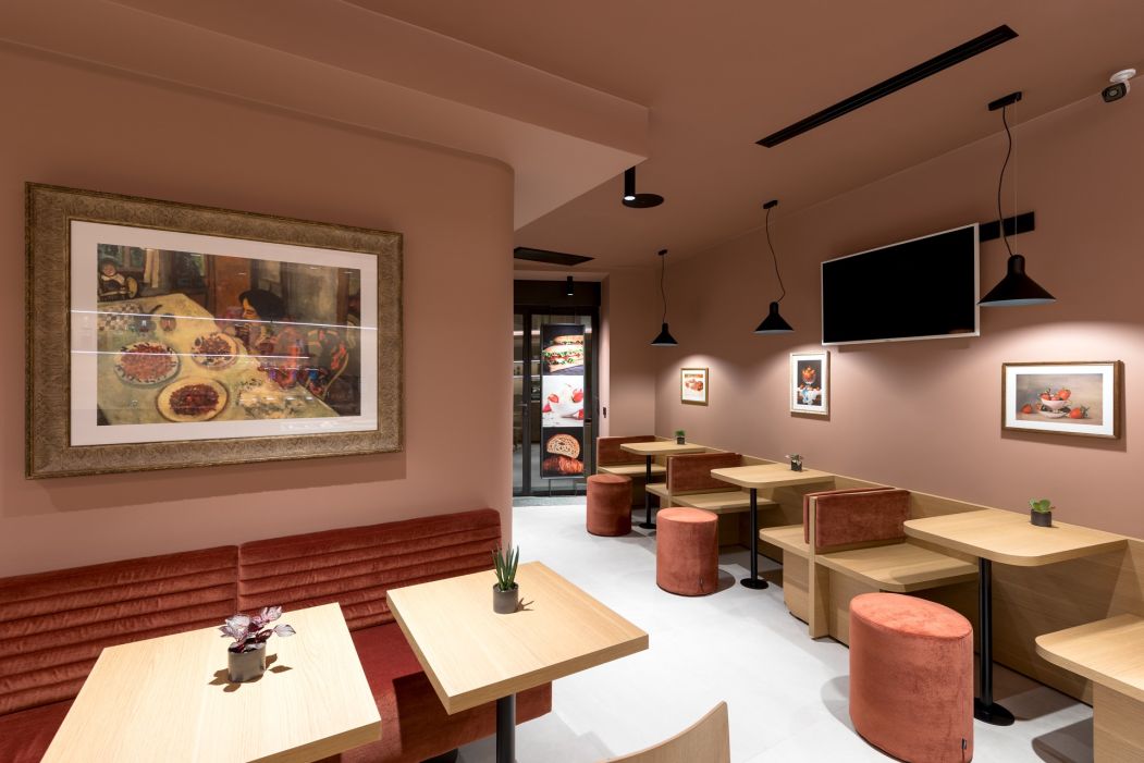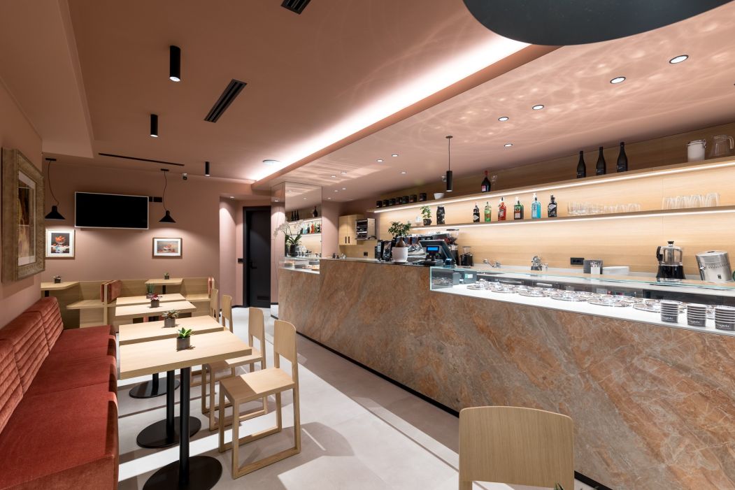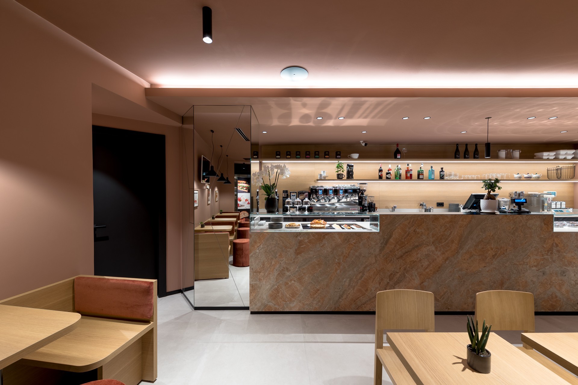 Per farlo, è stato introdotto un nuovo rivestimento cromatico che avvolge pareti e soffitto, generando un morbido effetto “scatola” che definisce e avvolge lo spazio interno, rendendolo visivamente accogliente e riconoscibile.