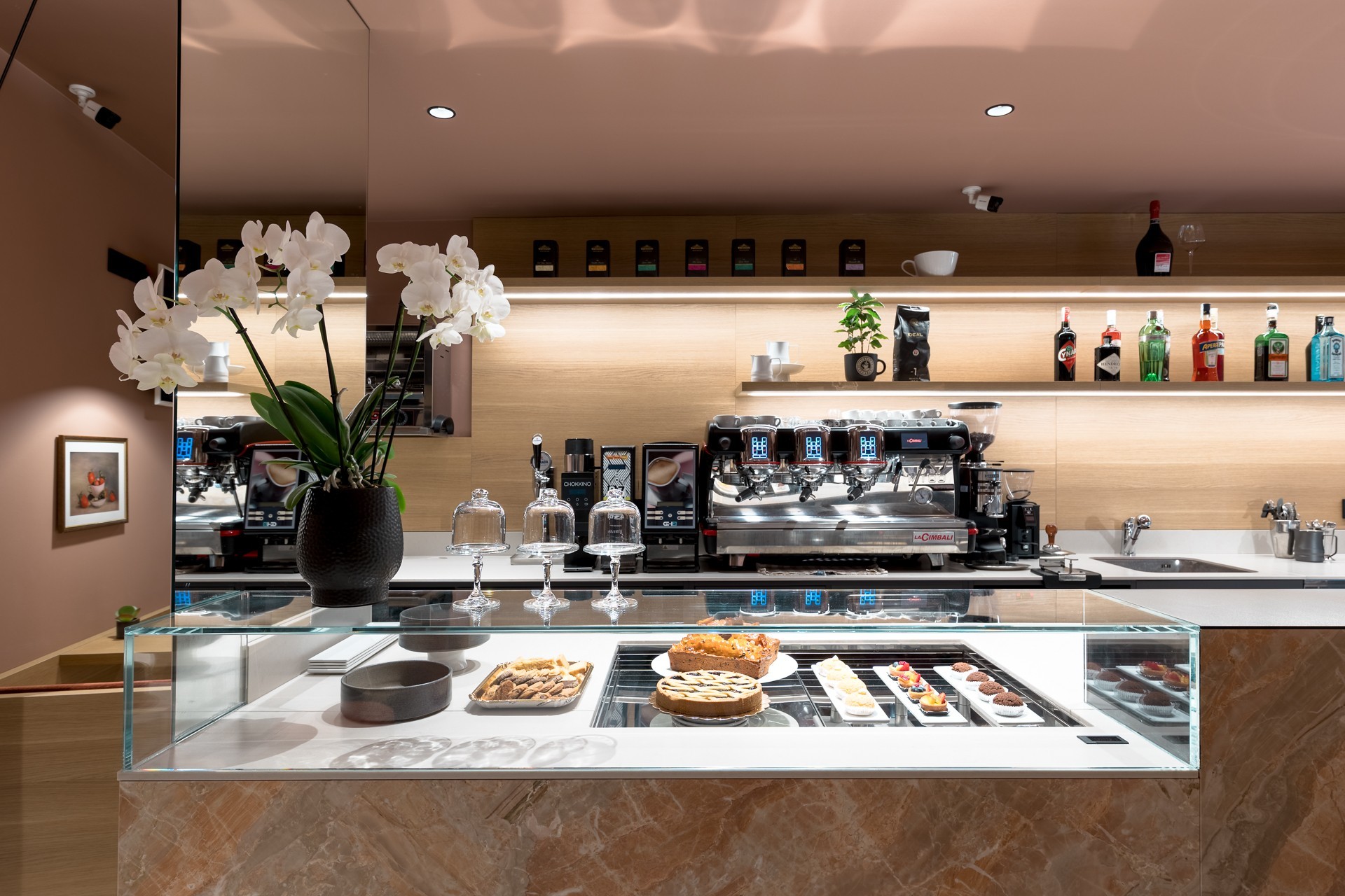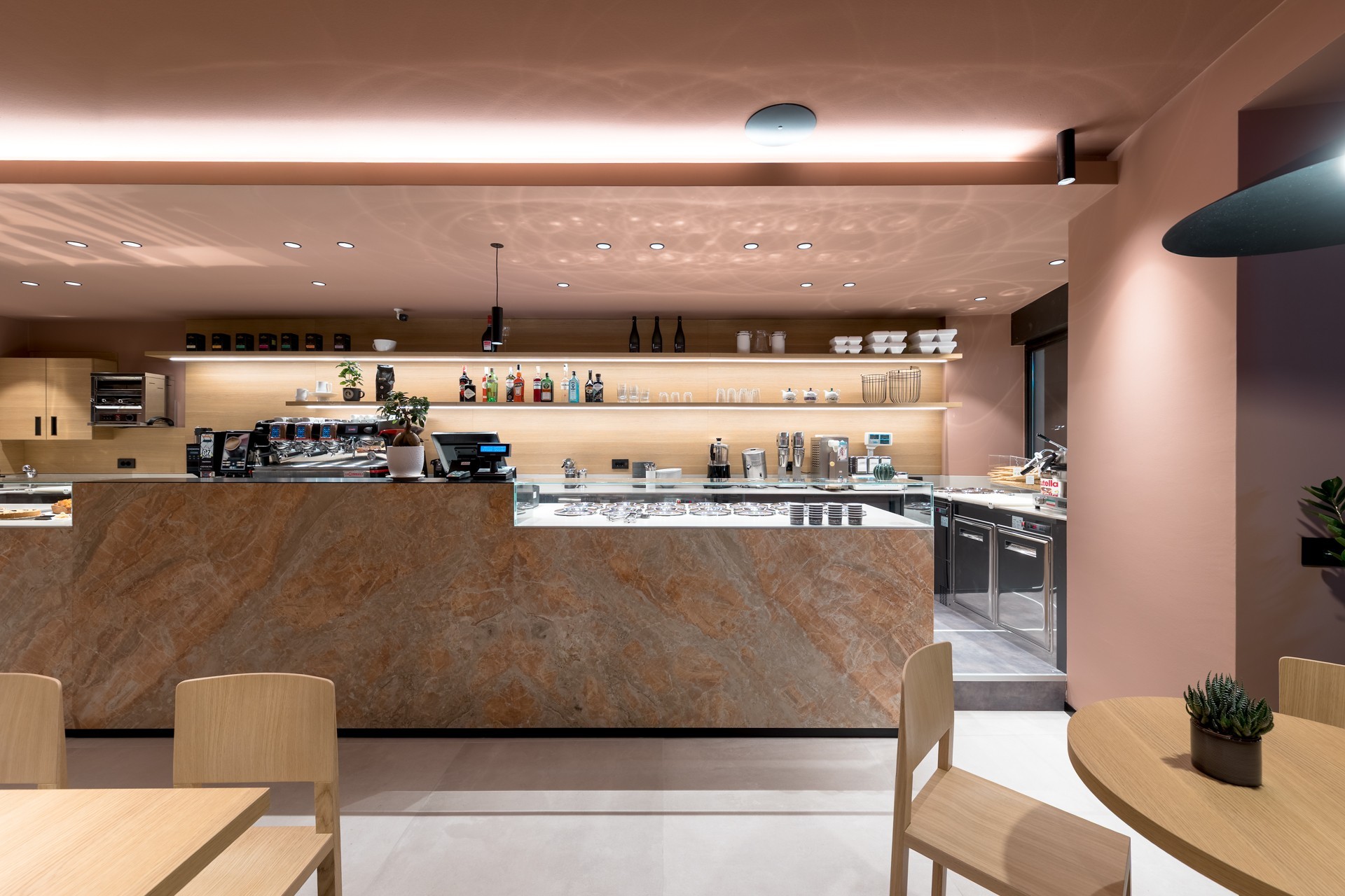 Un’arte del colore, che si riflette nelle venature del marmo del bancone: queste richiamano il movimento della mantecazione, ma anche il fluire del gelato che si scioglie, creando un legame diretto tra forma, funzione e sensorialità.
